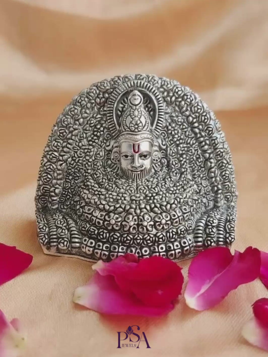 "Bask in the divine presence of Shree Khatu Shyam with our Pure Silver Khatu Shyam Idol. Revered for his eternal grace and compassionate nature, Khatu Shyamji is a symbol of devotion and divine blessings. Crafted with meticulous detail and sterling silver craftsmanship, this exquisite idol radiates the serene aura of Shree Khatu Shyam. Invite his auspicious blessings into your home and experience a sense of divine protection, love, and spiritual fulfillment. Embrace the divine essence of Khatu Shyam with this timeless masterpiece, elevating your spiritual journey to new heights."